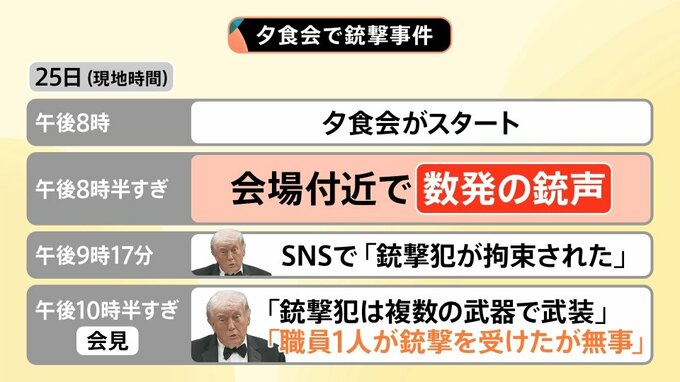 トランプ大統領が出席していた夕食会の会場近くで発生した銃撃事件。