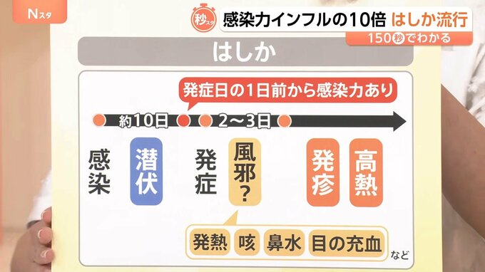 「はしか」は潜伏期間が長く、10日程度あります。発症すると、発熱・咳・鼻水・目の充血など風邪のような症状がでて、その間に動き回ると人にうつってしまいます。その後、発疹や高熱がでるということです。