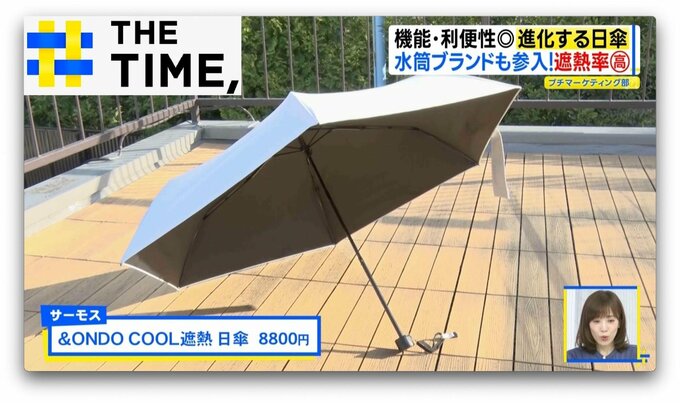 中でも3月に発売され話題となっているのが、水筒で有名な『サーモス』から発売された折り畳み式の「&ONDO COOL遮熱 日傘」(8800円)。その特徴はー