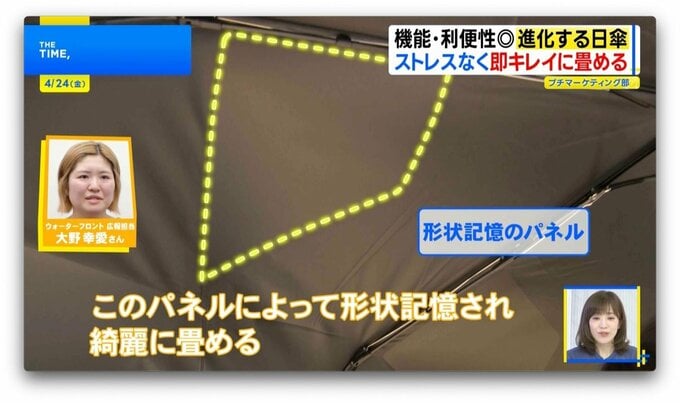「傘生地の裏面に“パネル”がついて、このパネルにより“形状記憶”されキレイに畳める」