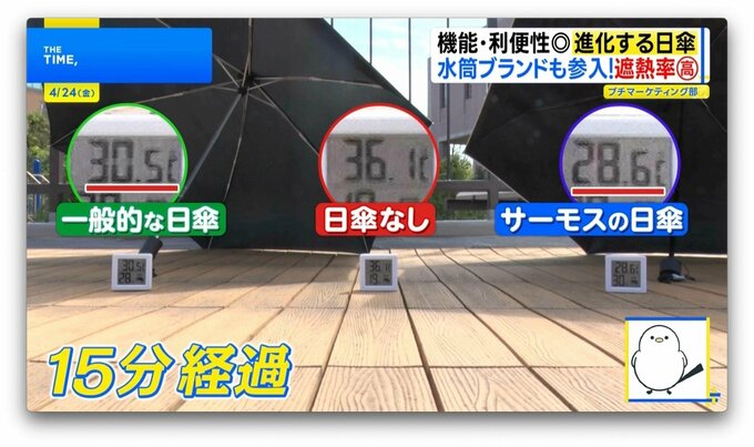 どれほど違いがあるのか、「日傘なし」「一般的な日傘」と15分後の気温を比較してみると、日傘なしと比べて8℃、一般的な傘よりも2℃低いという結果に!