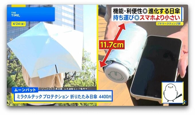 畳んだ時の大きさが「11.7cm」というコンパクトさが人気なのは、「ミラクルテック プロテクション 折りたたみ日傘」(ムーンバット/4400円)です。※ハンズなどの実店舗・公式通販などで販売中