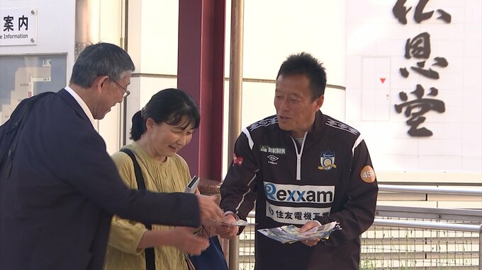あす(29日)、香川県高松市の屋島で行われるサッカーJ3、カマタマーレ讃岐のホーム戦を前に、選手と監督らがチラシを配り、来場を呼びかけました。(カマタマーレ讃岐 FW 大野耀平選手)「29日、屋島で試合やる…