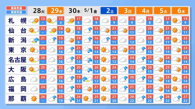 一方、あす29日(水・祝)の夜ごろから西から雨雲が近づく見込みで、5月1日(金)から2日(土)にかけて、発達する低気圧の影響で広い範囲で荒れた天気となり、警報級の大雨となる恐れがあります。