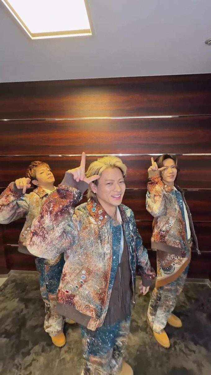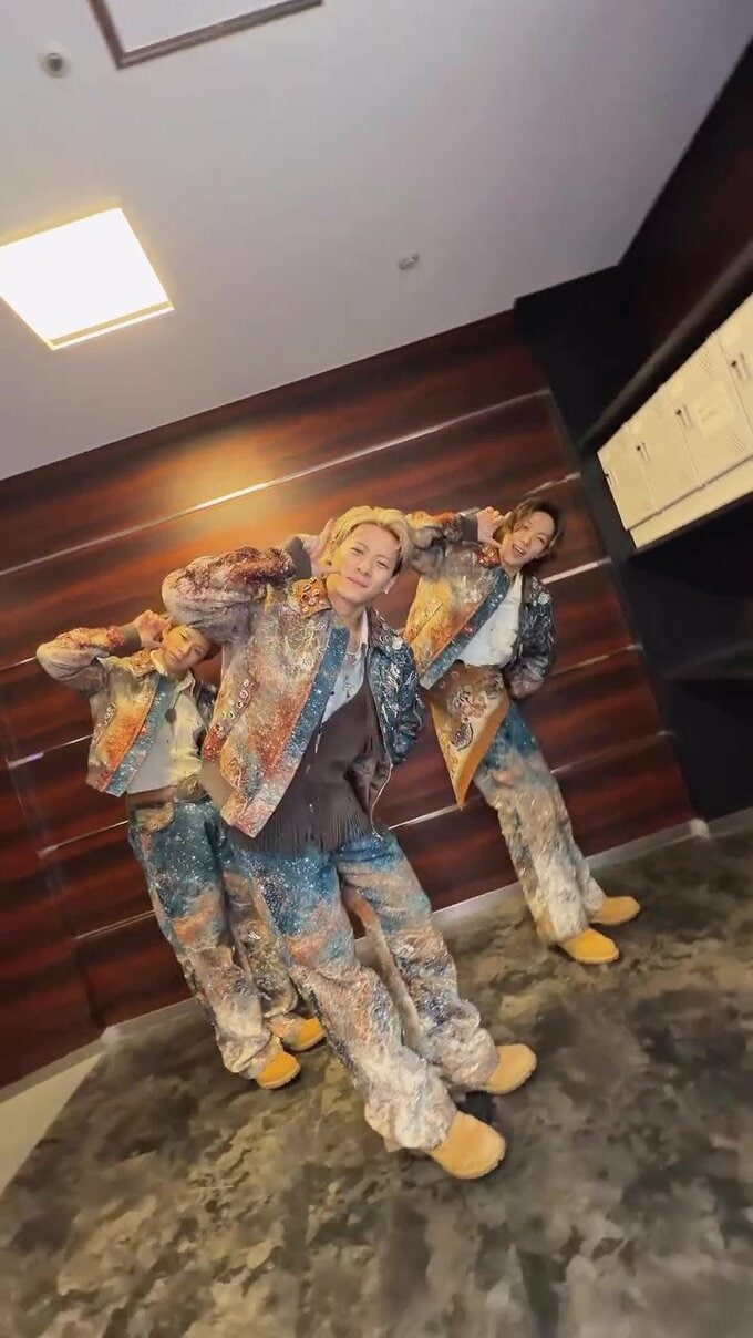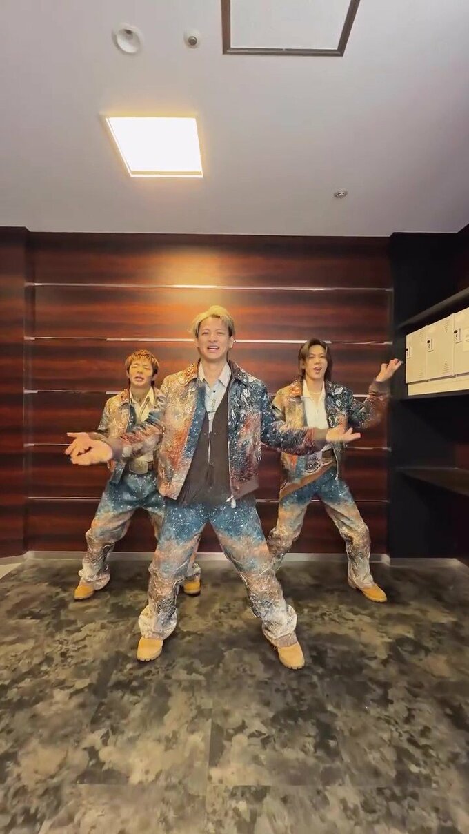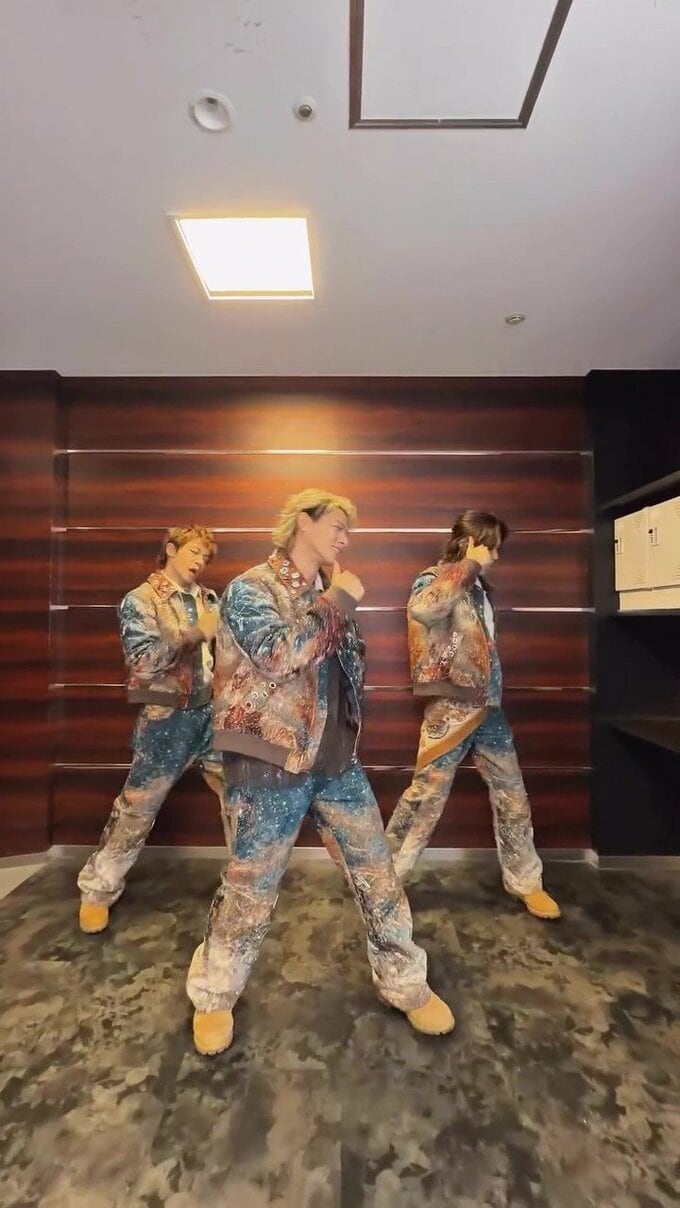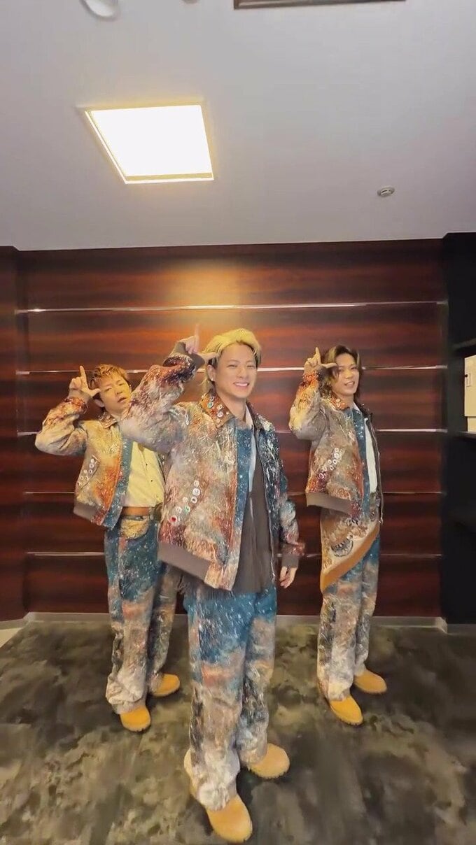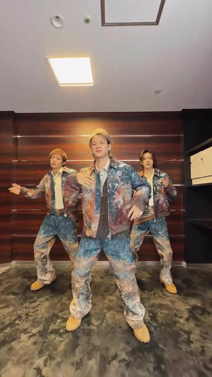 3人はこの曲のミュージックビデオでも着用していた天の川をイメージして鮮やかにペイントされたセットアップを着用。