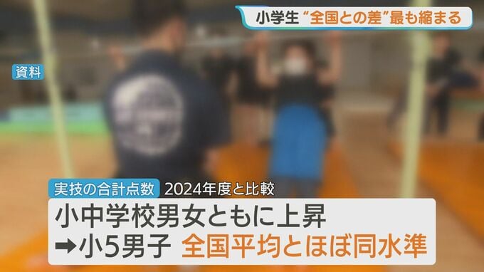 上体起こしや長座体前屈など8種目の実技の合計点数は、24年度に比べ、小中学校の男女ともに上昇していて、特に小学5年男子は全国平均とほぼ同じ水準でした。