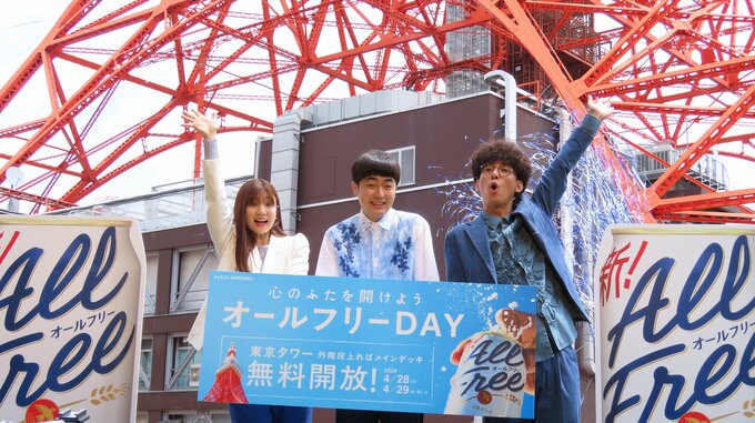 お笑いコンビ・たくろう( 赤木裕さん、きむらバンド さん)、タレントの小倉優子さんが、 サントリー(株)「東京タワー オールフリーDAY」体験取材会に登場しました。