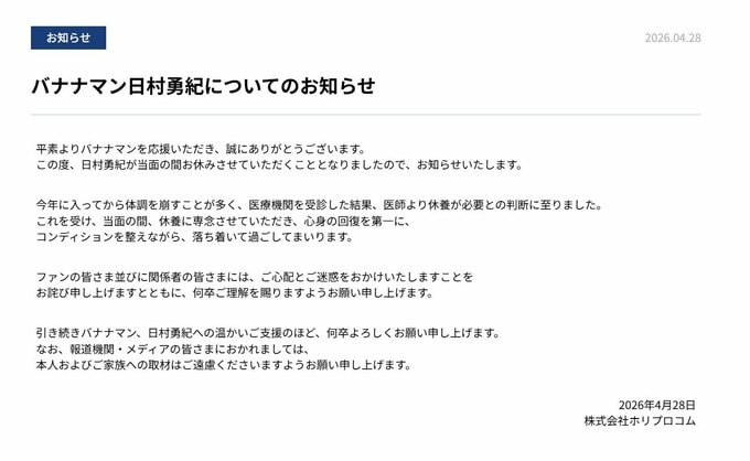 この度、日村勇紀が当面の間お休みさせていただくこととなりましたので、お知らせいたします。
