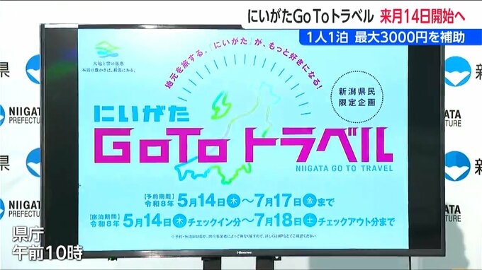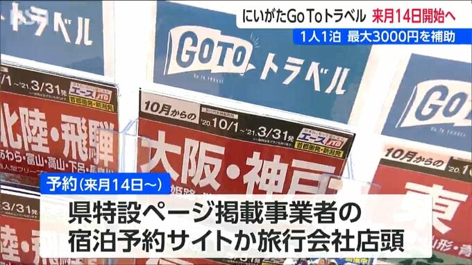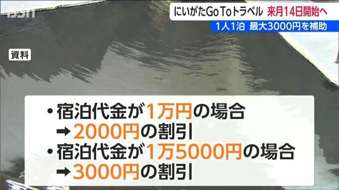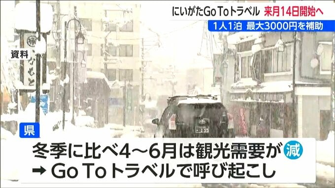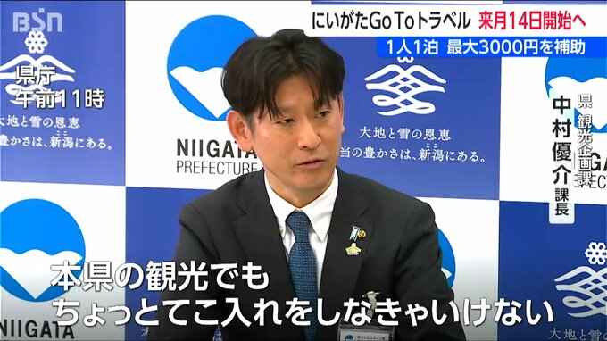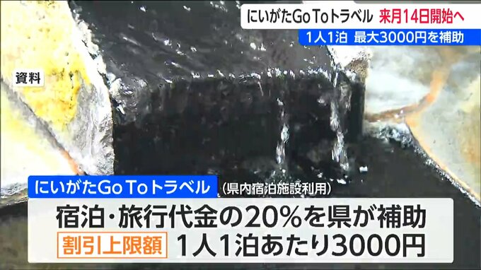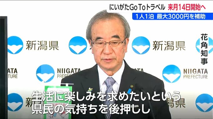 新潟県内の宿泊料金の20パーセントを支援する、県版「GoToトラベル」が来月14日から始まります。最大3000円の割引額となり、県は観光需要の喚起に期待しています。