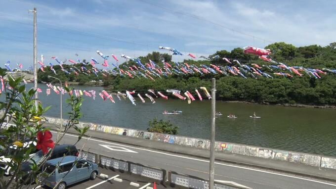 嘉手納町では毎年、比謝川にこいのぼりを掲揚していて、今年も幅約120メートルの川の上にワイヤーが張られ、200匹のこいのぼりが河口からの風を受けて元気に泳いでいます。