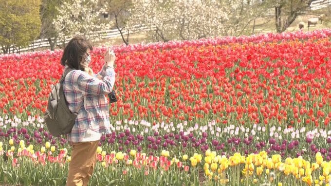 チューリップは今が満開で、ゴールデンウイーク中も白山連峰をバックに美しい景色を楽しめるということです。