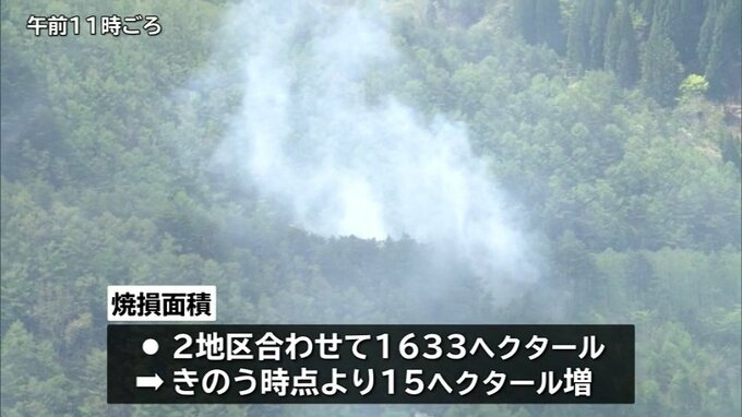 この火事の焼損面積は28日午前6時現在、小鎚地区と吉里吉里地区あわせて1633haとなり、27日時点より15ha増えました。