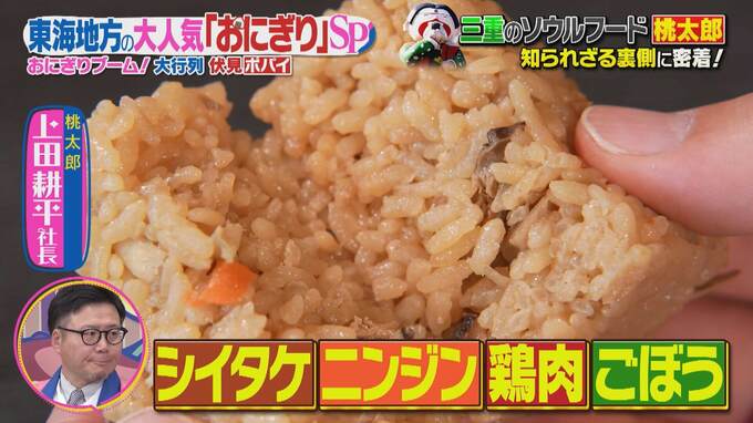 「桃太郎人気おにぎり」第1位は「味」。上田耕平社長によると、四日市では「かやくご飯」を“味ご飯”と言うそうです。桃太郎秘伝の炊き込みご飯である通称「味」は、シイタケ、ニンジン、鶏肉、ごぼうが入っていて、ちょっと濃いめの味付けとのこと。