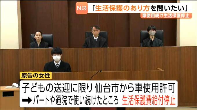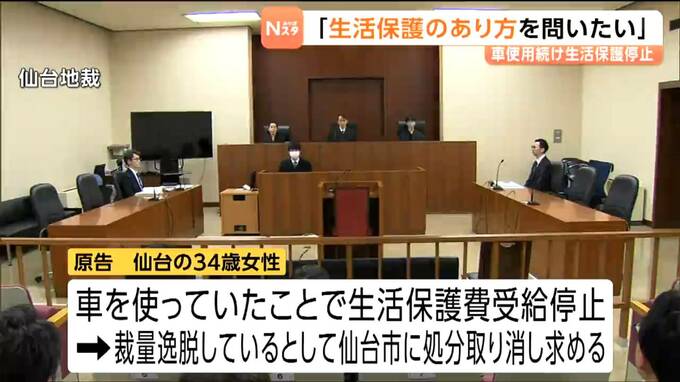 この裁判は、仙台市若林区に住む30代の女性が車を使っていたことで生活保護費の受給が停止されたことを巡るもので、女性側は、仙台市の処分は裁量を逸脱しているとして処分の取り消しを求めています。