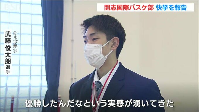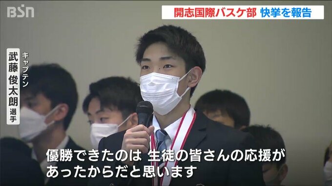 高校バスケの全国大会・ウインターカップで、県勢初優勝の快挙を果たした開志国際のバスケ部員が学校で優勝を報告しました。