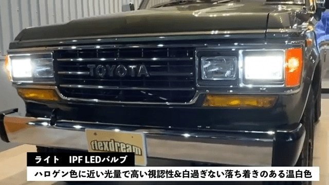 また、ヘッドライトは元々のハロゲンからLEDへ変更されていますが、ハロゲン特有の温かみのある色味を残した仕様で、ランクル60のレトロな外観と調和しています。駆動方式は基本的に2WDで走行し、山道や積雪時にはH4スイッチで4WDへ切り替えることができます。