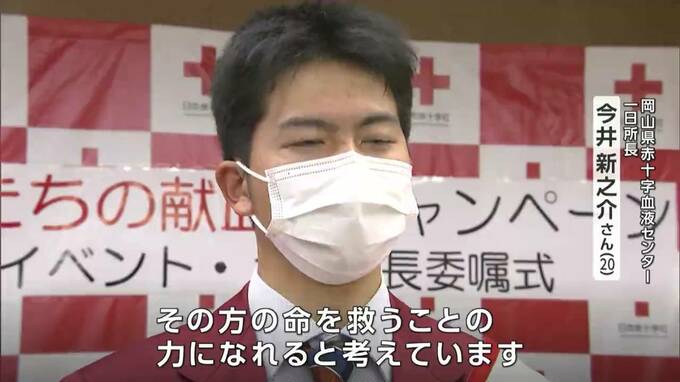 「若い世代にも、献血に関心を持ってほしい」と、20歳の男性が岡山県赤十字血液センターの1日所長に委嘱されました。1日所長を委嘱されたのは、倉敷市の会社員・今井新之介さん20歳です。岡山県では、この10年間で1…