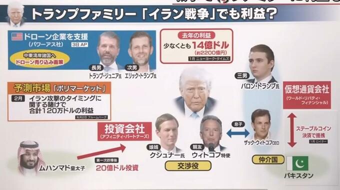 トランプ大統領の政治的立場を利用して、トランプファミリーが巨額の利益を上げているという噂が政権発足以来絶えることはないといわれてきた。その種の噂が現在のイランを巡る戦争でも湧き上がっている。戦争とファミリーの利益について議論した。