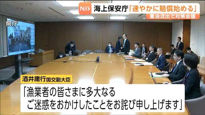 対策会議は、水産庁と県庁をオンラインでつないで行われ、海上保安庁を所管する国土交通省の酒井庸行副大臣が「漁業者の皆さまに多大なるご迷惑をおかけしたことをお詫び申し上げます」などと述べ陳謝しました。会議では海上保安庁から、漁業者の負担軽減のため被害が確定した部分から速やかに賠償を始める方針が示されました。