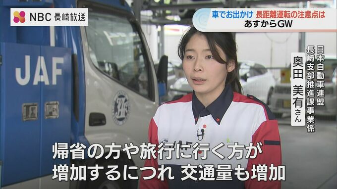 日本自動車連盟長崎支部推進課事業係 奥田美有さん:「規制の方だったり旅行に行かれる方が多くなるにつれて、交通量も増加しますのでそれに合わせて車のトラブルも大変多くなる傾向でございます。」