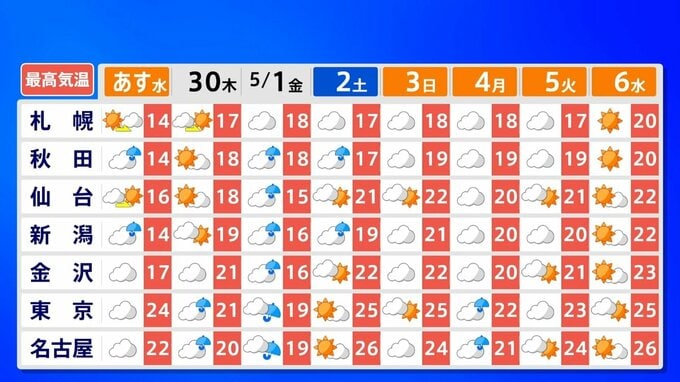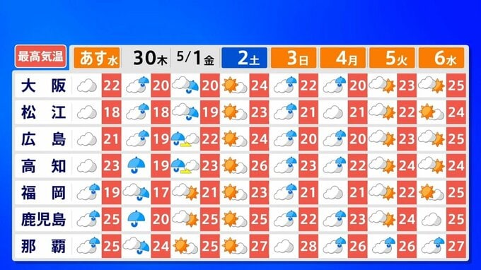 今年のGWは南の海上に前線が停滞しやすいため、くもりや雨の日が多くなりそうです。特に、4月30日(木)から5月1日(金)はまとまった雨になり、関東から西の太平洋側で警報級の大雨になるおそれもありそうです。