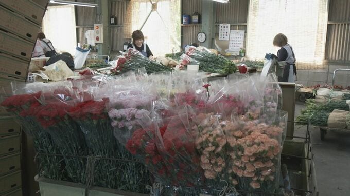 5月10日の母の日に向け、カーネーションの出荷作業が最盛期に。一方、ここにも中東情勢の影響が。