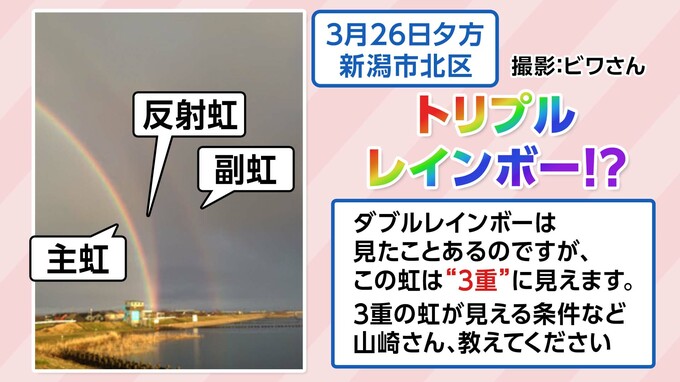 この場合、まず太陽光が水面で反射し、その光が水滴で2回反射したもので、結果として“3本の虹”が見えたといえそうです。