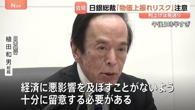 日本銀行は追加の利上げを見送りました。植田総裁は原油高などを踏まえ、「物価の上振れリスク」に注意が必要だと指摘しました。日本銀行 植田和男 総裁「物価上昇率が大きく上振れていくリスクが顕在化し、経済…