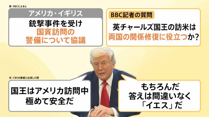 BBCの記者が「イギリスのチャールズ国王の訪米は、両国の関係修復に役立つか?」と質問したところ、トランプ大統領は「もちろんだ。答えは間違いなく『イエス』だ」と回答しました。