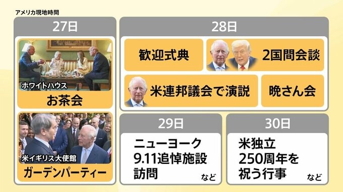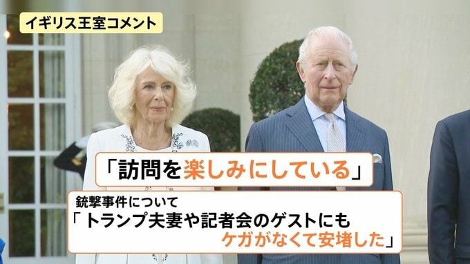 イギリス王室は「訪問を楽しみにしている」、銃撃事件については「トランプ夫妻や記者会のゲストにもケガがなくて安堵した」とコメントしています。
