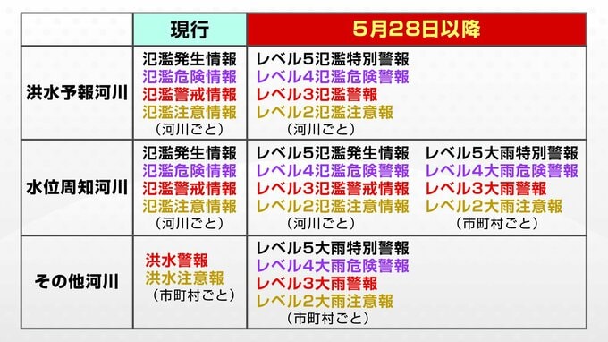 ①「洪水予報河川」では、「指定河川洪水予報」の名称がレベル2氾濫注意報、レベル3氾濫警報、レベル4氾濫危険警報、レベル5氾濫特別警報となり、相当する警戒レベルがつけられ、洪水に関する特別警報が新たに設けられました。これは従来通り河川ごとに発表されます。なお、現行の最も危険度が高い「氾濫発生情報」は氾濫の発生が現認された場合しか発表されないのに対し、「レベル5氾濫特別警報」は「氾濫開始相当水位」(5月下旬以降は「氾濫発生水位」に名称変更)に達したと判断されたタイミングで発表されることになりました。このため、発表のタイミングがこれまでよりやや早まることになります。