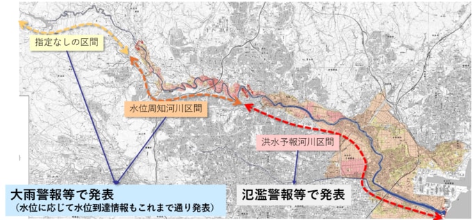 なお、河川によっては、区間によって①②③と扱いが分かれる川があります。例えば仙台市内を流れる七北田川は、下流は①「洪水予報河川区間」、中流は②「水位周知河川区間」、上流は③「それよりも小規模な河川」と位置づけられています。