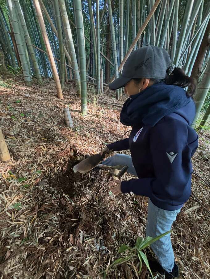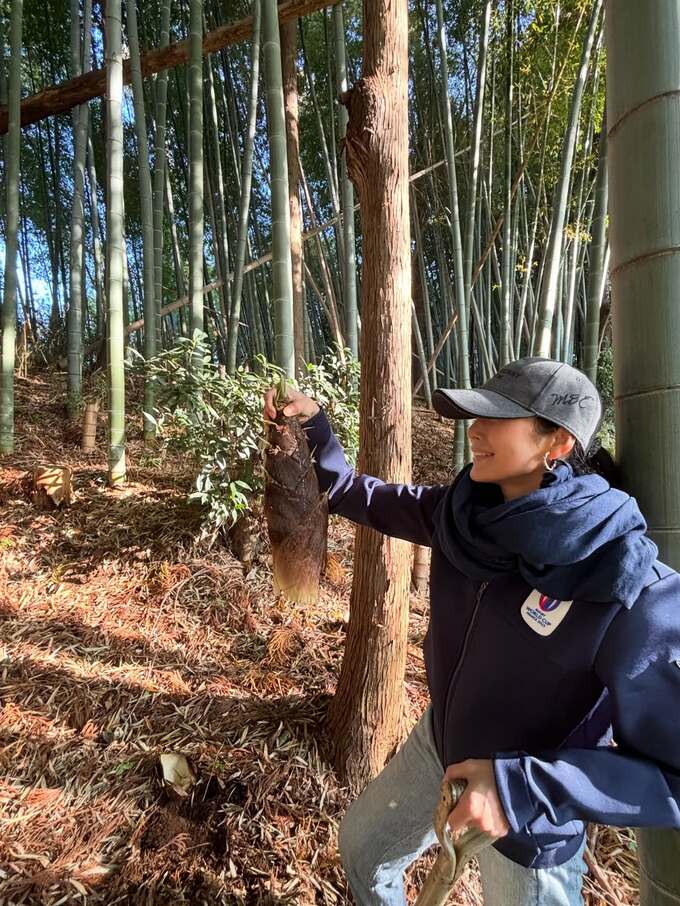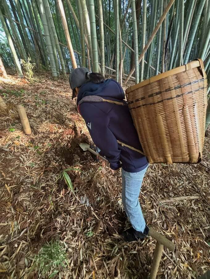 木村さんは「自然の恵み」「たけのこ掘りに2回も行ってきちゃった」とテキスト。カゴを背負って竹林の斜面を登り、スコップを入れてタケノコを収穫している写真を投稿しました。