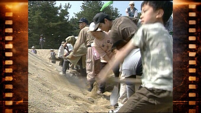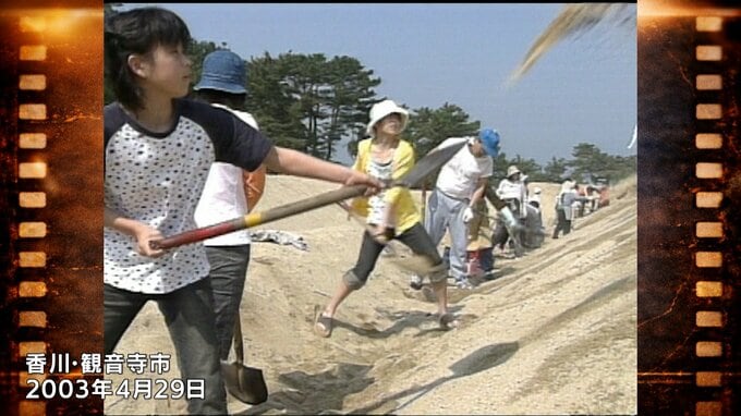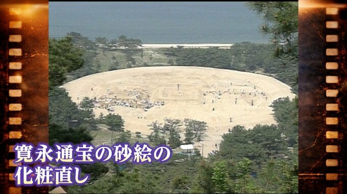 変わって、2003年。これは観音寺市の有明浜にある砂で描かれた寛永通宝の銭形の化粧直しなんです。