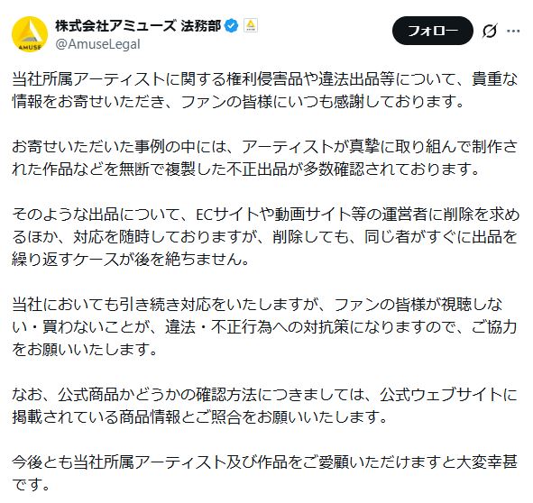ファンに向け「当社においても引き続き対応をいたしますが、ファンの皆様が視聴しない・買わないことが、違法・不正行為への対抗策になりますので、ご協力をお願いいたします。なお、公式商品かどうかの確認方法につきましては、公式ウェブサイトに掲載されている商品情報とご照合をお願いいたします」と呼びかけ、「今後とも当社所属アーティスト及び作品をご愛顧いただけますと大変幸甚です」と、締めくくりました。