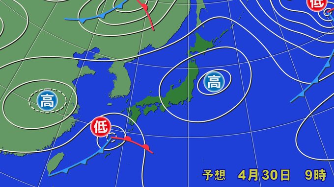 気象庁の週間天気予報によりますと、5⽉2⽇にかけて、発達する低気圧の影響で、北⽇本太平洋側を中⼼に⼤⾬や荒れた天気となる所があり、低気圧の発達の程度等によっては、警報級の⼤⾬となるおそれがあるということです。