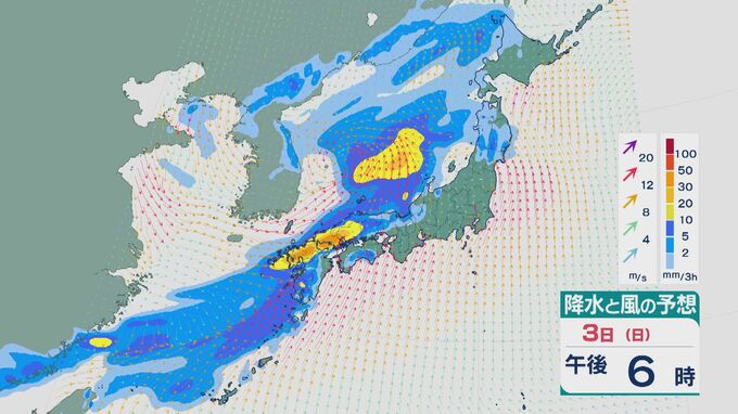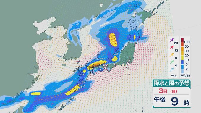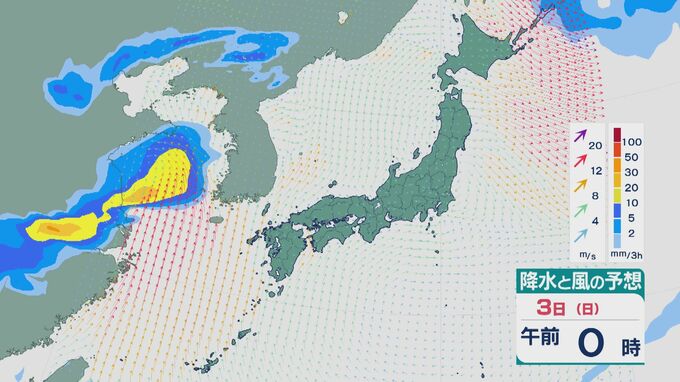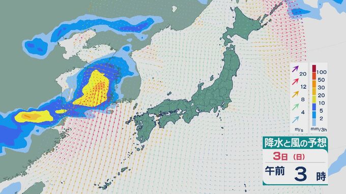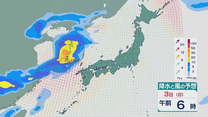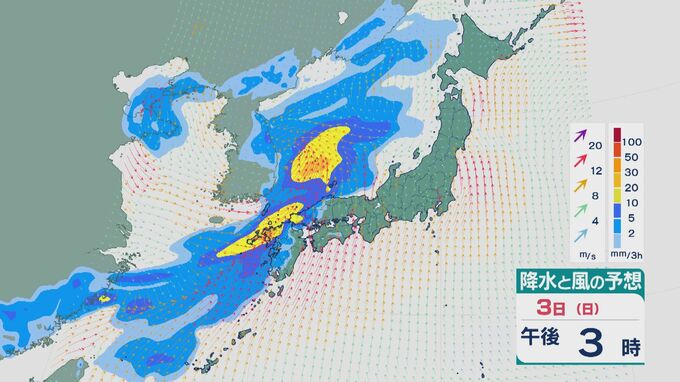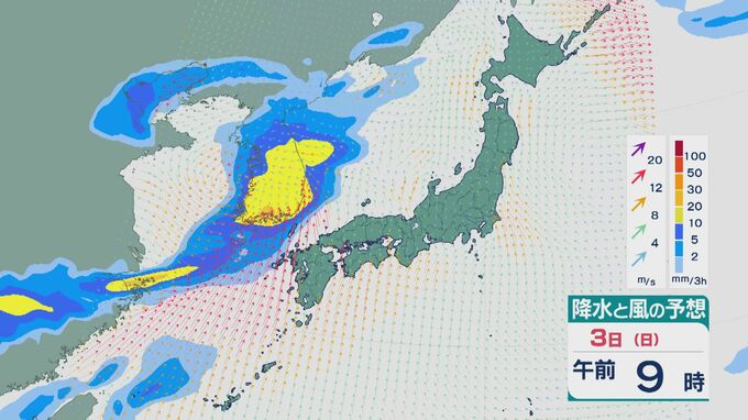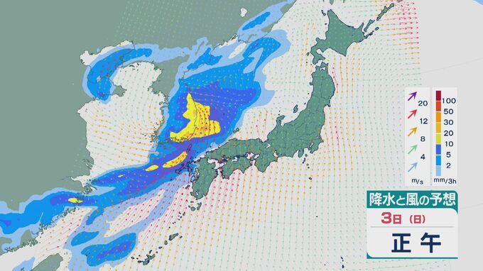 5月3日の雨と風の予想ですが、低気圧は朝鮮半島を抜け日本海を北東方向に進みそうです。寒冷前線の通過にともない、昼過ぎから九州北部で雨が強まり、夜にかけて近畿や北陸などにも発達した雨雲がやってきそうです。
