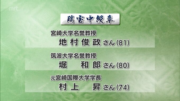 続いて、公共的な業務に長年従事し、功労を積み重ねた人に贈られる瑞宝中綬章には、宮崎大学名誉教授の地村俊政さん81歳ら3人が選ばれました。