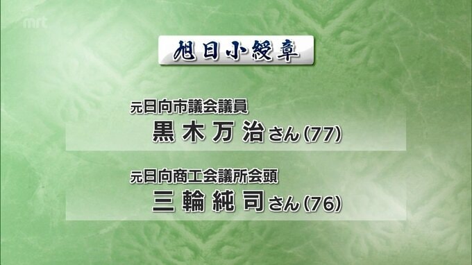 旭日小綬章に元日向市議会議員の黒木万治さん77歳、元日向商工会議所会頭の三輪純司さん76歳が選ばれました。