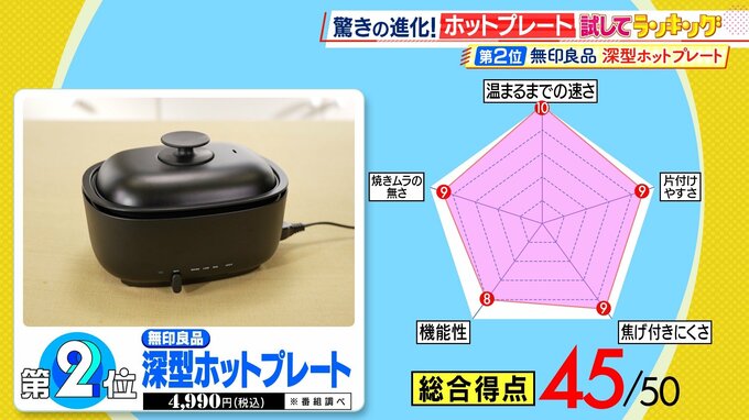 コンパクトなデザインながら全項目で8点以上と驚きの性能を発揮。中でも「温まるまでの速さ」は2分30秒と圧倒的ナンバーワンだった。これ一台で焼肉はもちろん、煮る、茹でる、さらには蒸し料理まで作れるという、これぞ無印良品の新提案ともいえるホットプレート。