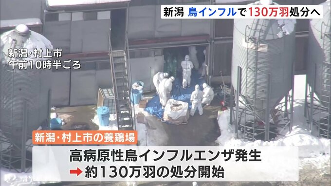 新潟県で鳥インフルエンザ。全国で2番目の規模となります。新潟県村上市の養鶏場で高病原性の鳥インフルエンザが発生し、午前8時からおよそ130万羽の処分が始まりました。処分されるニワトリの数は新潟県内では過…
