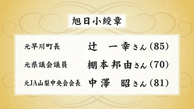 春の叙勲 県内は33人受章 優れた功績を挙げた人など 山梨 テレビ山梨 2026年4月29日(水) 13:00 国内 このうち『旭日小綬章』には早川町長を全国の首長で最多となる11期、44年間務めた辻一幸さん、元県議会議員の棚本邦由さん、元JA山梨中央会会長の中澤昭さんの3人が選ばれました。