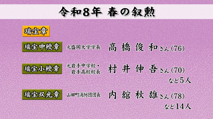 公共的な業務に長年従事した人に贈られる瑞宝章は、中綬章を元・盛岡大学学長の高橋俊和さん、小綬章を元・岩手中学校・岩手高校校長の村井伸吾さんら5人、双光章を元・山田町消防団団長の内舘秋雄さんら14人が受章しました。