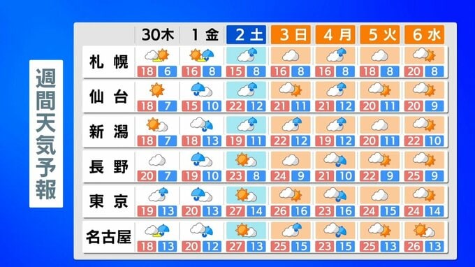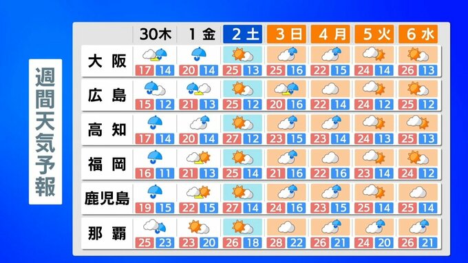 このGW中は、低気圧や前線が日本付近を通過しやすいため、くもりや雨の日が多くなりそうです。その中でも広範囲で晴れやすいのは5月2日(土)と連休最終日の5月6日(水)です。