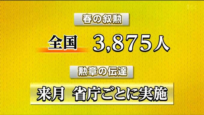 全国では3875人が受章し、勲章の伝達式は来月、省庁ごとに行われます。