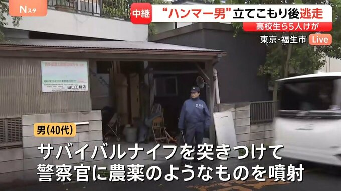 警視庁などによりますと、午前7時すぎ、福生市加美平の路上で、40代の男が男子高校生2人を次々とハンマーで殴り、自宅に逃げ込んだ後、サバイバルナイフを突きつけたうえで、駆けつけた警察官に農薬とみられるものを噴射したということです。