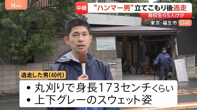 男は丸刈りで身長173センチくらい、上下グレーのスウェット姿だということで、警視庁が殺人未遂事件として、逃げた男の行方を追っています。