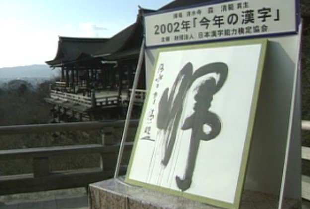 京都・清水寺で見事に書き上げられたのは「帰(き・かえる)」の一文字。過去最多6万人余の応募から選ばれました。この年、北朝鮮に拉致された5人が24年ぶりに帰国したことにくわえて、昔の楽曲がリバイバルして大ヒットしたこと(「亜麻色の髪の乙女」島谷ひとみ「大きな古時計」平井堅)も理由として挙げられました。ちなみに2位は「北(きた)」、3位は「拉(ら)」やはり北朝鮮の印象が強かった年です。
