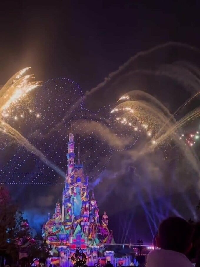 園内には夜まで滞在したようで、プロジェクションマッピングや花火、そしてドローンを取り入れた夜のショーの光景なども動画で写し出されています。