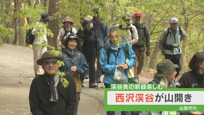 山梨市の西沢渓谷が山開きを迎え、登山道入り口のツルを斧で切る神事が行われ登山シーズンが幕を開けました。
